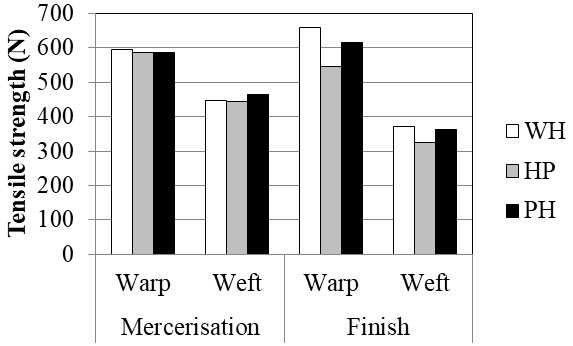 In Figure 9 and Figure 10, the tensile and tearing properties have been analyzed after mercerization and final finish. It was observed that the three samples do not show any significant difference in tensile strength values due to difference in processing route followed up to mercerization. But after final finish, a difference can be noticed among three samples. The tensile strength values show a decreasing trend in order of without heat set, pretreated then heat set and heat set then pretreated respectively. Similar trend was seen in tensile strength after finish in weft direction.