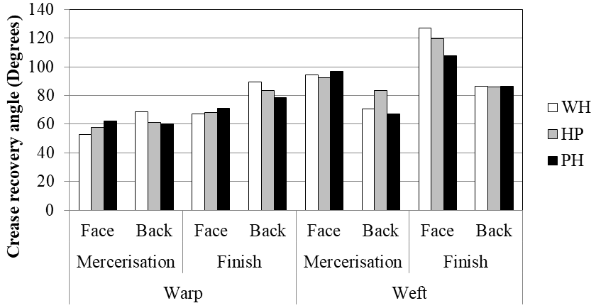 The Figure 11 shows the crease recovery angle for face and back in warp and weft directions for three samples. The crease recovery angle was higher in weft direction than in warp because of the incorporation of spandex filament in weft yarns that results in a more flexible yarn. There was an improvement in crease recovery angle in all the three samples after finish. However, without heat set sample shows the most significant increase in crease recovery angle. The results of wrinkle recovery test and drape are shown in Table 5. The rating for wrinkle recovery shows no significant difference among three object samples. In case of drape, the drape coefficient was higher for without heat set sample followed by heat set then pretreated and pretreated then heat set sample.