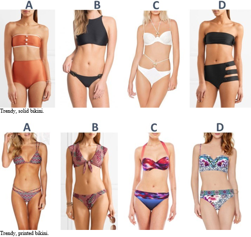 In swimwear, three main characteristics define the product: shape, color, and style. The female market has two main shapes: one-pieces and bikinis. Regarding color, products can be divided into two main categories: solids and prints. Solids are garments comprising one or more colors without any prints, and prints are garments with different graphical shapes that can be a single graphic shape or repeated graphic shapes such as stripes. Style can also be split into several different groups. To narrow these down, we opted to base the categories proposed by Englis, Solomon, and Ashmore,31 who identified eight distinct categories as the most prevalent beauty types in the United States; i.e., classic, feminine, sensual, exotic, cute, girl-next-door, sex kitten, and trendy. Their study was based on beauty types, but we decided to use that as a reference for style because swimwear is very closely related to women’s body perceptions, and shape and style are critical in defining women’s preferences for swimwear.7 From the eight types, we extracted classic, sensual, and trendy since they are more understandable in the native languages of Hebrew and Portuguese, while cute, girl-next-door, and sex kitten are culturally related to the United States and are harder to translate.