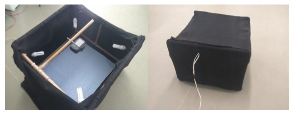 Figure 1 (a) Dark chamber with equipment fixed on the upper face and the textile sample on the lower side; (b) Dark chamber fully enclosed with external illumination.