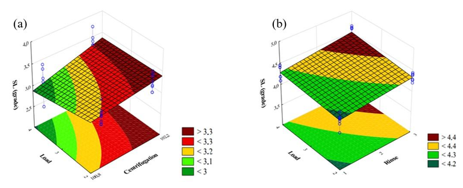 In Figure 5b it can be seen how the interaction between the number of washes and load capacity affects the SL of the cotton fabric after drying on the clothesline. These factors were selected to be analyzed in the response surface graph, as they were statistically significant at the 5% significance level and had the greatest effect on cotton SL after drying on the clothesline, as shown in Table 5, resulting in a moderate slope of the plane. When analyzing the number of rinses, there appears to be a positive correlation between this factor and the dependent variable, SL. The greater the amount of water in contact with the fabric, the greater the level of SL obtained, corresponding to the smoother fabric. This fact is related to the plasticizing effect of the water molecule, which provided sufficient lubrication to guarantee a higher SL when in contact with the fibers present in the cotton fabric. On the other hand, the washing load presented a positive correlation with the SL. That is, the more significant amount of load had a positive effect on the SL of the samples. However, it is worth noting that after the samples were washed inside the machine, in a confined space, they were put to dry on a clothesline. Thus, as reported in the item Experimental Design, the fabrics had their fibers realigned through the action of gravitational force, causing an effective improvement in the SL of cotton fabrics. It should also be noted that both the increase in the number of rinses and the increase in the washing load provided an increase in the SL of the fabrics, as can be seen in the graph in the region demarcated with the dark red color (SL > 4.4). In general, after drying in a dryer, the SL presented smaller, more crumpled grades, with SL close to grade 3. This evident difference in the wrinkling of the cotton samples was due to the domestic dryer's movements imposed on the fabric, different temperature gradients throughout the drying cycle, prolonged drying time, and drying load that allowed constant fiber-to-fiber friction between the fabrics.