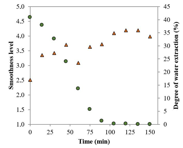 Figure 6 Relationship between the smoothness level (triangle symbols) and the degree of water extraction (circle symbols) in the dryer in the normal program.