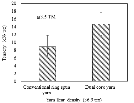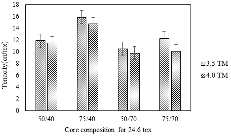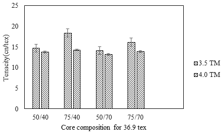 Tenacity of all dual core spun yarns are measured and results are analysed to understand the effects of factors like core structure and twist multiplier on tenacity. Linear density is found to have no significant effect on the tenacity of yarn. The tenacity of yarn without a core i.e. for the conventional Ring spun yarn is 8.88cN/tex, which is significantly lower than all the core spun yarn. The effects of yarn count, core polyester content, core Lycra content, and TM are shown in Figure 3 and Figure 4.