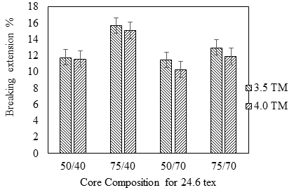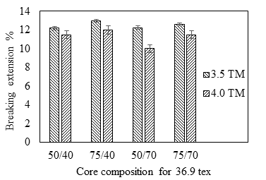 The breaking extension results of the yarns suggest that the core composition and twist multiplier (TM) significantly affect the breaking extension of yarn. In contrast, the yarn count has no significant effect on it. The breaking extension of conventional ring spun yarn is 5.9%, and that of dual core yarn is 12.27% which is significantly higher than conventional ring spun yarn. The graphical representation of results is shown in Figure 5 and Figure 6 for the 36.9 tex and 24.6 tex yarns, respectively. The breaking extension has been found to increase with the increase in linear density polyester filament while keeping Lycra content unchanged. This is due to polyester T400 contains good elasticity because of its structure. It is composed of two types of polyester, (40% 3-GT type and 60 % 2-GT) which shows smooth and regular crimp that is the cause of the elastic properties shown by the yarn. This characteristic of the core causes less disintegration of the sheath structure, thus resisting failure of the yarn. This is manifested as breaking extension. While keeping the linear density of polyester unchanged, as the linear density of Lycra increases, breaking extension of yarn decreases. Lycra being highly extendable, a differential nature of extension of core and sheath is expected. The core component can easily extend on loading, which causes early disintegration of the sheath leading to the failure of the yarn. Thus, the breaking extension of yarn reduces with increasing the Lycra content. Breaking extension starts to decrease with increase in twist multiplier. This happens because the yarn becomes compact, and cohesion between the fibres of sheath and between core and sheath increases. The failure of the yarn is also expected to be dominated by fibre breakage.