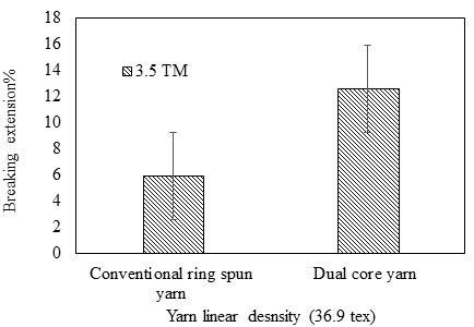 The breaking extension of conventional ring spun yarn and dual core yarn are 5.9% and 12.55%, respectively. The Lycra/polyester filament in the core adds additional extensibility to the core spun yarn as compared to the conventional ring spun yarn which is shown in Figure 8.