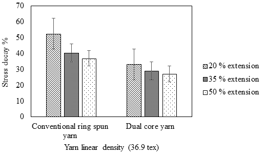 For stress relaxation, all the yarns are tested using 250mm test specimen length and 25mm/min cross-head speed. The testing is conducted on Zwick universal tensile tester. Stress relaxation is obtained for an extension level of 20%, 35% and 50% for each yarn sample. The stress decay% (manifests stress relaxation) is calculated according to equation (5).