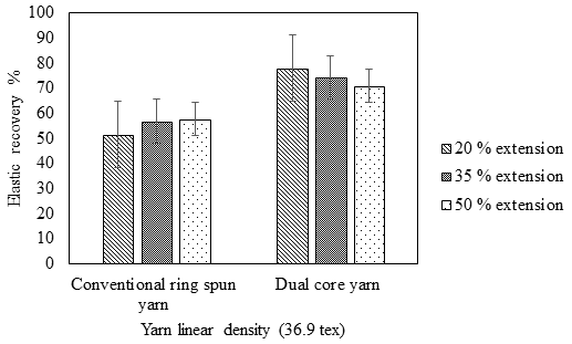 The immediate elastic recovery refers to the ability of the textile material to recover from deformation immediately on withdrawal of load. For the conventional ring spun yarn, immediate elastic recovery for 20%, 35% and 50% extension are found to be 13.8%, 17.6% and 18.4%, respectively. Whereas, the immediate elastic recovery for dual core spun yarns is found to be 23.4%, 29.1% and 34.1%, respectively. Immediate elastic recovery decreases with increase in the linear density for both the yarns at all the levels of extension. Immediate elastic recovery increases as polyester content increases and similar trend is observed for different levels of the twist multiplier of dual core yarn. In case of conventional ring spun yarn, immediate elastic recovery increases with increase in the extension level.