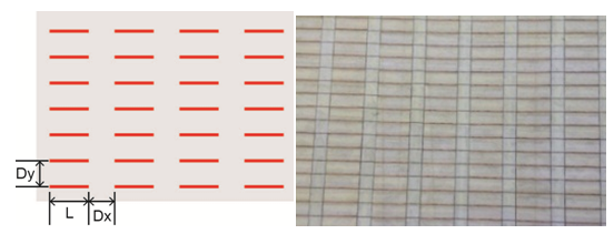 Silver filaments, the single yarn fineness of 10 tex, were used to build up U type FSF. The FSF specimens have the same unit size and different assembling number of silver filaments, including 4, 16 and 28yarns (corresponding to 408dtex, 1630dtex and 2852dtex respectively), as shown in Table 2. The substrate layers are polyester fabric and cellular PE plates, supporting conductive yarns to prevent collapsing, as shown in Figure 3.