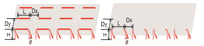 Velvet inclination angle θ: Cheng et al.22 analyzed that the resonance point moved to the lower frequency with an increase of the velvet height or the unit length L.22 However, the increase of velvet inclination angle θ leads to two results, the equivalent height of the unit decreasing and the velvet equivalent length in the electric field increases. When θ is less than a certain angle, the impact of the equivalent height on the resonance frequency is less than the impact of the velvet equivalent length. Thus, resonance frequency moves to the low frequency. When θ is greater than a certain angle; the resonance frequency maintains a certain value. As a whole, the resonance frequency has decreased gradually and then held the resonance frequency nearby a constant value during the inclination angleθ