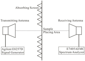 In this work, the shielding chamber was used to test the transmission coefficient of samples. Testing system included an Agilent E8257D signal generator (250KHz-40GHz), an E7405AEMC spectrum analyzer (100Hz-26.5GHz), two horn antennas (1GHz-18GHz) and an absorbing screen etc. According to GJB 6190-2008 (Measuring method for shielding effectiveness of electromagnetic shielding materials), environmental conditions, transmitting and receiving antenna position were set up. The sample transmission coefficient of 1-18GHz was tested by transverse electric wave. Figure 7 is diagram of the testing system, where the center of the transmitting antenna, the testing samples and the receiving antenna were located on the same horizontal line. And the testing sample size was 18cm×18cm.