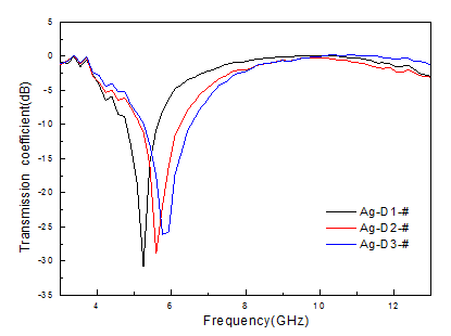 The linear density of yarns is an important design parameter of FSF. In this study, the velvet linear density is represented by the assembling number of silver filament. The assembling number of conductive yarns in the unit structure of the sample Ag-D series was 4, 16 and 28 respectively, and corresponding yarn linear density was 408dtex, 1630dtex, and 2852dtex. Test results of transmission coefficient are shown in Figure 9. The resonance frequency of the samples varies from 5.25GHz to 5.83GHz. With an increase of the conductive yarn linear density, the distance between the units and the unit coupling capacitance decrease. As a result, the resonance frequency is increased slowly. Because of increasing velvet linear density, the gap between velvet may affect the frequency response characteristics.
