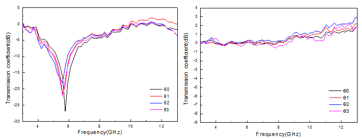In Figure 4(a), the sample has a U type unit and the resonance frequency is in the range 5.25-5.76GHz. In Figure 4(b), the transmission coefficient of the sample with a double-column type unit is about 0dB. The analysis is as follows.\