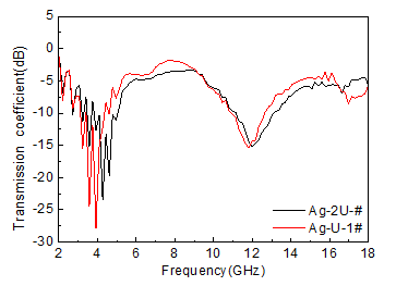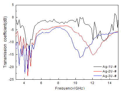 The same length of single U, the different number of U type: The single-U length was 6mm. With the increase of the number of connected U type, the sample Ag-1U-#, Ag-2U-#, Ag-3U-#, whose unit length were 6mm, 12mm and 18mm respectively, were made. The transmission coefficient curve is studied, and the test results are shown in Figure 12. In the graph, the first resonance frequency of the three curves is around 5GHz, and the second resonance point is in 10-14GHz. The more the number of connected U type is, the smaller the resonance frequency results. Due to the increase of the U-shaped number, the unit total length of the bottom is longer, which is easy to resonate at lower frequency.
