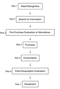 Studying consumer behavior is an ongoing process that is between the consumer and brands and retailers. The consumer decision process are the steps an individual must take to make a purchase decision. Consumer Decision Process (CDP), presented by Blackwell, breaks this model into seven steps as seen in Figure 1.33,34 The process is divided into three phases; pre-purchase (steps one-three), purchase (step four), and post purchase (steps five-seven).32 Although this process is modeled in a linear fashion, the method is continuous. The post purchase decisions affect need recognition and views of the brand or retailer.