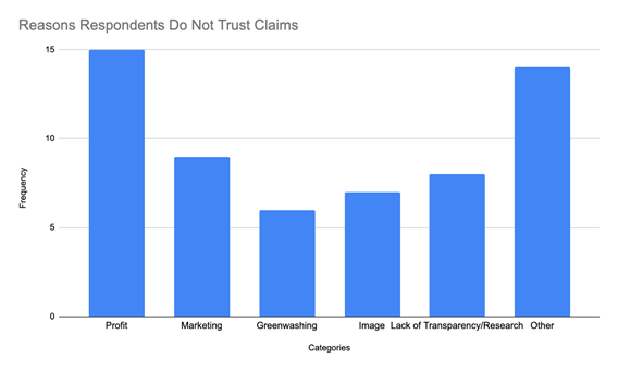 To further investigate why respondents did not trust the sustainability claims that brands and retailers were making, participants were asked to briefly describe their beliefs. Of the 297 responses, 237 were N/A or left blank. For the purpose of this research, N/A is interpreted as unable to identify why they do not trust in the sustainability claims of brands and retailers. With the 60 remaining responses key words and phrases were used to evaluated trends in responses. Appendix D lists the method used. As seen in Figure 5, six categories were developed; profit, marketing, greenwashing, image, lack of transparency and research, other. The top three reasons participants were wary of the claims from brands and retailers were profit, other and marketing. Many responses indicated that they felt money was the driving force for sustainability initiatives rather than a goal to better company practices. The “other” category consisted of phrases such as “fast fashion can never be sustainable” and “exaggerated claims.” This leads to the conclusion that participants had a cynical view of the fashion industry. Finally, the marketing responses indicated that participants believed that brands and retailers were using sustainability initiatives as a marketing tool to encourage more consumption through the use of buzzwords.