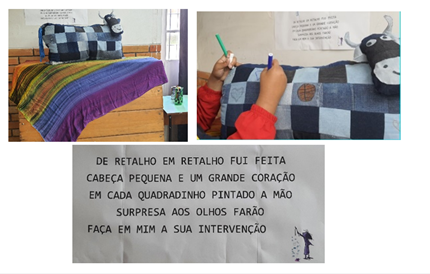 Given the students' positive reaction to the use of textile residues in artistic processes involving the cow parade movement, the researchers felt mobilized to propose for the art exhibition, in the same way, a cow sculpture. Thus, we boldly built a cow of approximately 100cm by 50cm so that the visitors of the exhibition could interact with it. Our purpose was aligned with the processes advocated by contemporary art in which the relationship with the artistic object becomes the experience, per se, the art form.