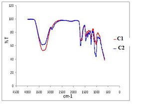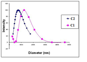 Figure 1 shows the multimodal size distribution analyses of the DMDHEU reagents that are used to calculate the effective diameter (Deff). Deff is the diameter that a sphere would have to diffuse at the same rate as the particle being measured and may result from one or more populations of the particles present in the emulsions. If the system is polydisperse, Deff is an average diameter, and if weighted by intensity, it is an averaged intensity of scattered light by each particle. From the multimodal size distribution, it appeared that in the investigated DMDHEU reagents nano-marked and conventional crosslinking agents (C1 and C2 respectively), there is one remarkable population of particles arising major fluctuation; and the fluctuation of C1 corresponded to larger diameters than that of C2; thus Deff is measured to be 739,6nm for C2 and 851,8nm for C1 (Figure 1). The polydispersity values for C2 and C1 were 0,315 and 0,319 respectively, which means that emulsions prepared had similar distributions.