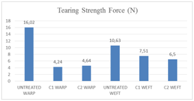 Tearing strength: When the results are compared, the tearing strength results are decreased nearly 74% for both recipes when comparing untreated samples like the study was done.13 In weft direction the tearing strength loss is about 30% for C1 recipe and 38% for C2 recipe (Figure 4). It is clearly said that the loss is more in C2 recipe than C1 recipe. It is known that in weft direction less strong yarns are used than warp yarns.
