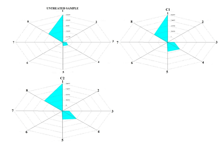 Multiaxial graphics are drawn by MATLAB, and the biggest area is chosen to determine the best recipe for this study. According to results obtained from multiaxial graphics, the biggest area gives the best recipe. Because the assumption for this study is “The higher the tensile strength (in warp and weft directions), the tear strength (in warp and weft directions), the crease recovery angle (in warp and weft directions), the whiteness index and the abrasion resistance retention (as the ratio of abraded mass to total fabric mass), the greater the area and the more acceptable the recipe is”. The crease recovery angle becomes significant with the least physical property decrease.So it could not be true when we decide the recipe just only according to crease recovery angle result (Figure 5). According to the multiaxial graph results C1 recipe has the biggest area. Also the total crease recovery angle of C1 recipe is 280,35°, it is the biggest angle among three situation, untreated fabric sample (231,25°), C1 recipeand C2 recipe (277,5°).