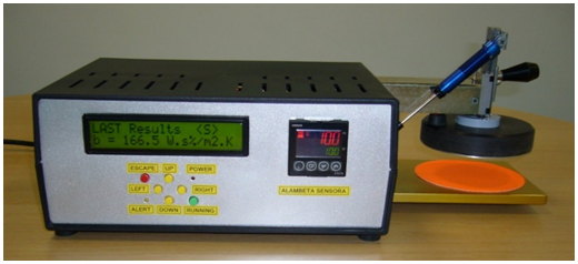 Thermal absorptivity of fabrics, as well as their thermal resistance and thermal conductivity were in this study determined by the new ALAMBETA tester displayed on the Figure 1. New tester employs the same measuring principle as the previous model, but the new the device is smaller, lighter (7kg) and enables easier calibration of all the measured thermal parameters.