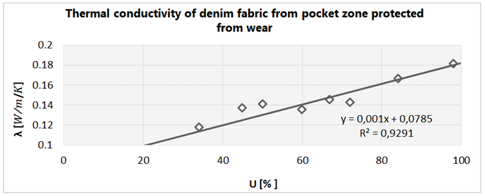 For the purpose of this study, it is important to note, that thermal conductivity of liquid water is taken as 0.61W/m/K whereas thermal conductivity of dry textile fabrics lies in the range 0.033–0.09W/m/K. That is why, the amount of the moisture absorbed in the fabric should not exceed certain threshold level, otherwise thermal comfort properties of the denims would get reduced.