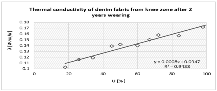 As regards dry thermal conductivity, the lowest value or highest thermal resistance was found at the knee sample due to the most intensive wear effect resulting in internal yarn fibrillation and hairiness. On the contrary, in wet state the finer internal structure causes higher levels of this parameter (Figure 2) (Figure 3).