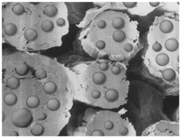 Fiber spinning: Microcapsules of various shapes - round, square and triangular within fibers at the polymer stage. The PCM microcapsules are permanently fixed within the fiber structure during the wet spinning procedure of fiber manufacture. Micro encapsulation gives a softer hand, greater stretch, more breathability and air permeability to the fabrics. The pictures show the acrylic fibers spun with PCMs (Figure 2).
