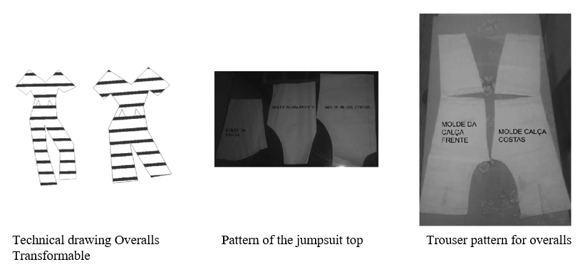 According to Mandelli,9 the pattern-making process must contain information identifying the product model on the patterns. The work brings images containing the information of the patterns representing, in detail, each part that makes up the pieces produced: front dress pattern, back dress pattern, sleeve of the jumpsuit blouse, pants pattern mainly, the parts that can be transformed.