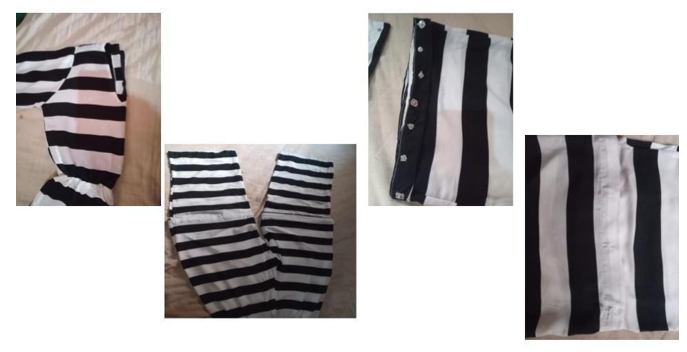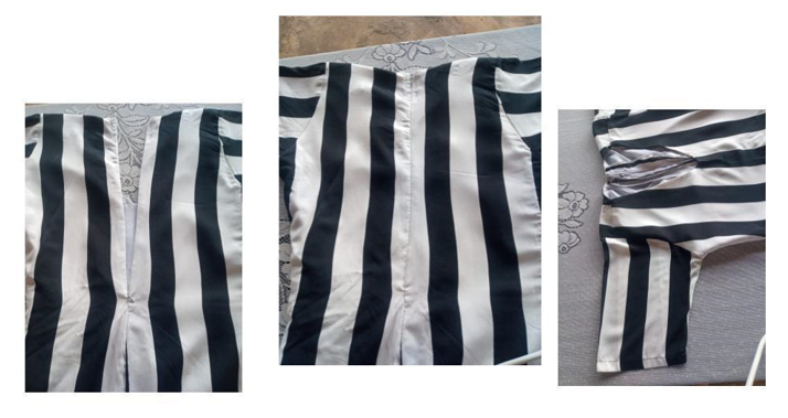 The second look is a transformable jumpsuit, which can be worn short or long. With short sleeves and a V-neckline, the jumpsuit has press studs below the knee, so that part of the legs can be removed and replaced, allowing for different lengths. The fabric used in both looks was striped viscose. Figure 6 shows the process of creating the transformable jumpsuit, with the technical drawing and modeling of the garment: