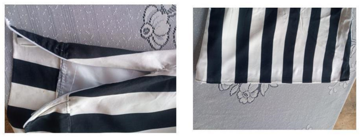 The garments produced were made to measure and the result can be seen in the images below (Figures 7–10) as well as the finishes on the tight-fitting dress, with a zipper at the back, a V-neckline and short sleeves. The skirt is straight, with a waistband and side zipper, and can be worn as part of the proposed look or not, expanding the possibilities of use.