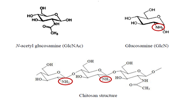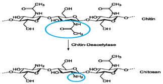Chitosan is obtained from partial deacetylation of chitin which is removal of acetyl groups (-CH3CO) on N-acetyl glucosamine (GlcNAc) units of chitin polymer to reveal amino groups (-NH2), as shown in Figure 2.