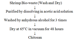 For making chitosan shrimp shells are washed and dried. After Drying the shrimp shell is made powder form by blending. Then they are treated by acetic acid to dissolve calcium carbonate and then washed in anhydrous alcohol to solubilize protein; the result of these 2 steps is chitin. These two steps can be employed in reverse order. After those chemical treatments, chitin will go through the drying process at 65˚C temp.to obtain chitosan. A diagram of the commercial chitosan production process is shown in Figure 3.