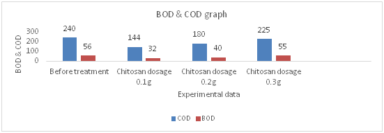 The results indicated that percentage of COD and BOD removal was not increased with the flocculant dosage. Among three samples the highest COD & BOD removal at 0.1g chitosan dosage at 150ml. At this condition, the COD reduction is 40% and BOD reduction is 43%. At 0.2g the COD reduction is 25 % and BOD reduction is 29%. When the flocculant dose was above 0.1g, the efficiency began to decrease. Clearly the COD and BOD reduction percentage decreased above 0.1g. But the BOD & COD reduction efficiency lies within the range for chitosan dosage of 0.1 to 0.2g. And at 0.3g dosage it is out of range. So the optimum dosage was between 0.1 to 0.2g (Figure 6).