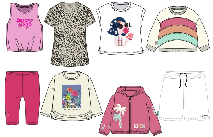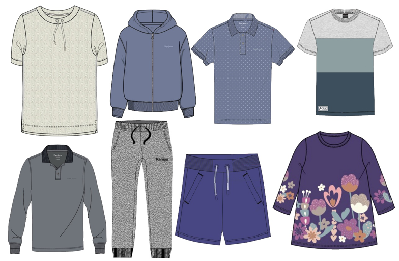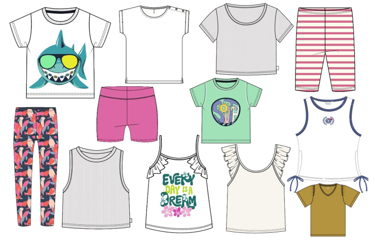 The Ready-Made Garments (RMG) industry is a cornerstone of Bangladesh’s economy, contributing more than 81.29% to export revenues and employing millions, with a significant proportion being women.1 Bangladesh’s knitwear sector or knit basics, particularly in essential items like different kind of T-shirts, tank tops, and leggings, dresses and under garments has experienced exceptional growth driven by production efficiency and rising global demand for knitwear’s. Figures 2–5 depicts a collection of knit basics flat sketches showcasing a variety of knits basics/garments including tank tops, t-shirts, sweatshirts, leggings, jackets, knit dresses, under garments and shorts.