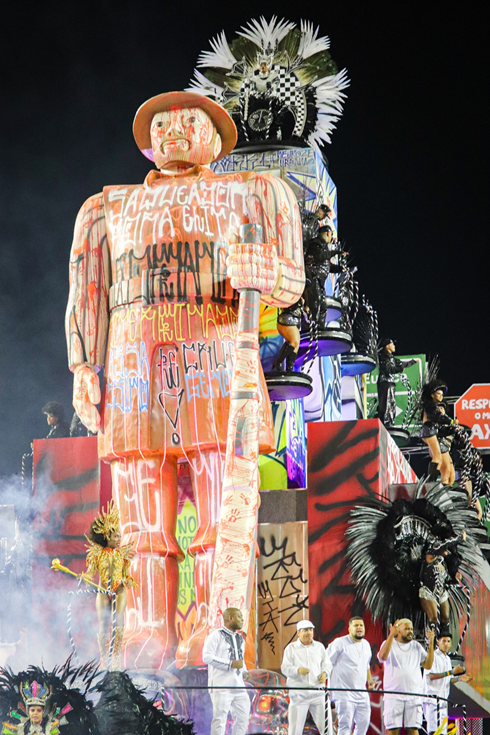 Figure 1 is emblematic for highlighting a reproduction of the Borba Gato statue in the city of São Paulo, in the Santo Amaro region. This historical monument is a representation of the oppressor, of power, of a personality who is notoriously known for clearing land, hunting down indigenous people to be enslaved and enslaving fugitives. According to classical historiography, it makes sense to have this kind of narrative, but it omits other narratives that have been explored by Cultural History, and as the samba enredo chosen gave vent to the rhythm of rap, especially being inspired by lyrics by Racionais Mc's, the song prioritizes equality, justice, valuing the voices of the periphery who are mostly black and therefore descendants of enslaved people who were hunted by the bandeirantes. Thus, having a bandeirante in the spotlight covered in various graffiti with peripheral empowerment is a form of liberation and historical reparation.
