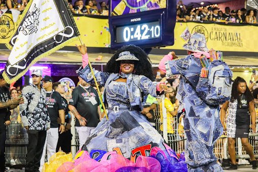 Another highlight is the use of a mix of jeans to make up the look of the mestre sala and porta bandeira4 (Figure 2), a garment that is key to everyday life and has a low cost, and is widely used both by rap singers and by the community that listens to them or even "just" lives in the peripheries.
