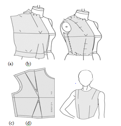 Figure 1 The draping process from 2 D muslin to finished garment. (a) and (b) Use of muslin to drape front bodice; (c) Finished pattern with seam allowance; (d) Finished garment.