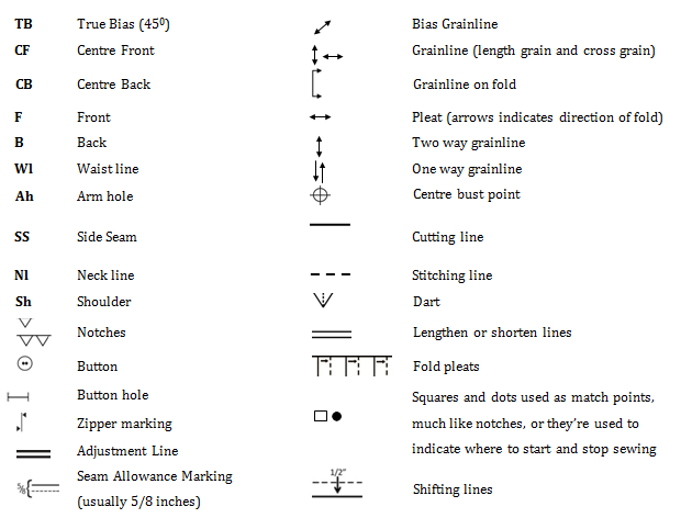 Although fashion trends come and go, the pattern making principles do not change. The rules and methods are always followed for designing and drafting pattern pieces. Finally, the production pattern is achieved that is correct and perfect, containing every pattern piece required completing the garment. In the production, a pattern has the seam allowance and all requisite information like grain line, style name, size, and sometimes the number of cuts.9 Different signs which a pattern maker uses in patterns to communicate with the buyer and the end users are (Figure 6):