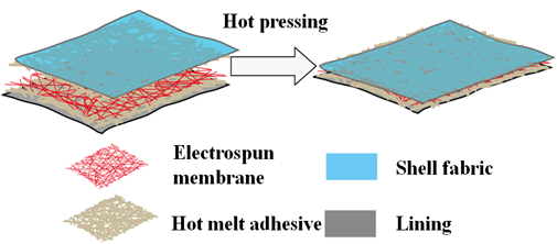 In this work, Nylon and cotton blended fabrics were used as shell fabric and warp knitted fabric was used as lining. Polyester (PET) and polyurethane (PU) were purchased from the Far Eastern Industry (Shanghai) Ltd., N, N-dimethylformamide (DMF), trifluoroacetic acid (TFA) and dichloromethane (DMC) are all analytical grade and were purchased from Beijing Tonguing Fine Chemicals Co., Ltd., copolyamide (COPA) was used as hot-melt adhesives and purchased from Tangshan Fenghe Plastic Co., Ltd.. Electro spinning device was laboratory made.