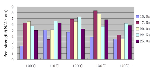 Beside the choice of adhesive and sizing method, the hot pressing condition is vital for the peel strength of laminated fabrics. In order to decide the hot pressing condition, the COPA was first analyzed by DSC, as displayed in Figure 3. The melting temperature is not obvious and set various hot pressing temperatures at 100˚C, 110˚C, 120˚C, 130˚C and 140˚C. In the other hand, the hot pressing time is adjusted at 15s, 17.5s, 20s, 22.5s and 25s, respectively. The peel strength (adhesion strength) of laminated fabric is mainly related to the hot pressing condition. Generally, the stronger the adhesion is, the larger the peel strength is. By using PET 8 as a sample, a series of laminated fabrics were fabricated and the histogram of peel strength at different hot pressing conditions was illustrated in Figure 4. As shown in Figure 4, the peel strength of laminated fabrics are all larger than 5 N/2.5cm when the hot pressing temperature within 120~130˚C and hot pressing time within 17.5~22.5s. Further, the peel strength reached up to 8.34 N/2.5cm at hot pressing condition of 130˚C and 17.5s. The best hot pressing conditions for the laminated fabric consisting of other PET electrospun membranes and PU electrospun membrane are the same as that of PET8 electrospun membrane.