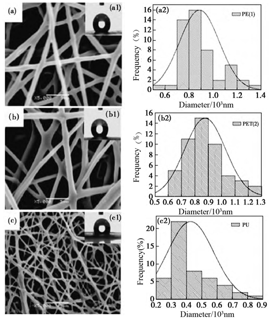 Figure 5 SEM pictures (left) and diameter distributions (right) of the electrospun membranes (a) PET6, (b) PET8 and (c) PU membrane. (a1), (b1) and (c1) are the water contact angles of the corresponding membrane, respectively; (a2), (b2) and (c2) are the diameter distribution histograms of the corresponding membranes, respectively.