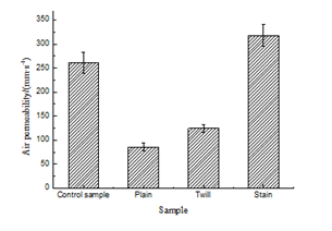 Air permeability: The air permeability of fabrics was tested according to the standard GB/T 5453-1997 "Textile-Determination of air permeability" through a digital meter of air permeability (YG (B) 461E, Wenzhou-Textile Standard Instrument Factory, China). When measured, the differential pressure was 100Pa and the test area was 20cm2. Each sample tested 10 times and averaged.