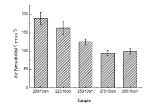 Figure 2 showed that air permeability of blended fabrics decreased with the increase of weft density. Because the spacing between the weft yarns of the blended fabrics decreased with the increase of the welt density, which led the covering factor of fabrics improved, and the porosity decreased. Thus the air permeability decreased.