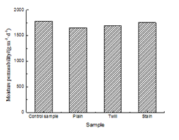 Figure 4 showed that with the increase of the weft density, the moisture permeability of fabrics changed not significantly. Mainly because when the weft density of blended fabrics increased, there was not much difference of the covering factor (the difference between the maximum value and the minimum value was only 2.77%), which indicated that changing the weft density of blended fabrics did not differently affect the moisture permeability. That weft density on the moisture permeability of the fabric was not significant.