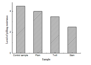 Figure 6 showed that among the fabrics changed structural parameters, the weft density of 5#~8# twill fabrics increased, which improved the covering factor and the cohesion of yarn and fibers. During the friction, the fibers not easily separated and exposed the surface of fabrics. So the level of pilling resistance was on the increase.