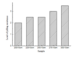 The pilling resistance of fabrics with different textures and weft densities were shown in Figure 5 & 6). Figure 5 showed that among different textures, the pilling resistance of blended fabrics changed from large to small in the order of plain (2#), twill (3#), stain (4#). Because the interwoven points of plain weave were more than twill and stain. Fibers among the plain fabrics could be better cohesion, which was not easy to be bending and pulling. So the level of pilling resistance of 1# was the highest, the twill and stain poor. Figure 5 also showed that the pilling resistance of spun silk fabrics was better than blended fabrics. As the blended yarn quality was poor Table 1, the number of surface hairiness was higher than spun silk, which was not conductive to the improvement of pilling resistance of fabrics.