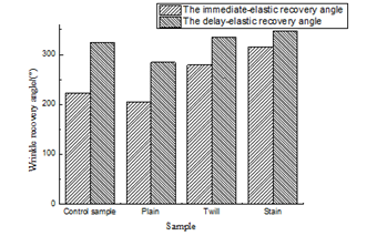 Wrinkle recovery performance: The crease recovery angle was tested according to the horizontal method of the standard GB/T 38l9-1997 "Textiles-Determination of the crease recovery-angle of recovery". Sample Compression load: (10±05) N; Test time: immediate elastic recovery was (15±1) s, slow elastic recovery 5min±5s. Each warp and weft of the fabric were tested three times then averaged. The sum of wrinkle recovery angle of the warp and weft indicated the crease recovery of the fabric.