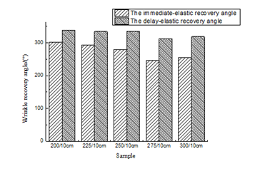 Figure 8 showed that among the fabrics changed structural parameters (5#~8# twill fabrics), the variation of the immediate-elastic recovery angle and delay-elastic recovery angle showed a slight decrease with the increase of weft density. The larger the weft density, the sliding resistance among the yarn in the fabrics was larger. The yarn would be more difficult for relative movement when the external force to release, so the wrinkle recovery tended to decrease.