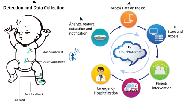 Sudden Infant Death Syndrome (SIDS) is the unexpected death of healthy babies who are less than a year old. SIDS is also known as crib death one of the most common cause of death in the United States1 with unexplained reasons which occur during the first year of an infant’s life. In a study, Moon and Task Force on Sudden Infant Death Syndrome,2 reported that every year in the US nearly 3500 infants die from sleep-related reasons which include ill-defined deaths, SIDS, and accidental choking and suffocation on the bed. American Academy of Pediatrics has identified three main risk factors that are believed to be the cause of SIDS.3 Firstly, vulnerable babies having low birth weight, or who are premature, or whose mother smoked before their birth or with unknown genetic factors. Commonly, 2-4-month-old babies are at the highest risk as 90% of total SIDS is reported to occur before 6 months of age. Thus, age is the second factor. The third risk factor is infants sleeping position or bedding or other things that parents can change like parents smoking, and recent infections. Findings show that infants sleeping on their bellies have comparatively more risk of SIDS than infants who sleep on their backs. Parents have been advised to use separate bedding without blanket or pillows which can cover the baby's face during sleeping. However, modern millennial parents are highly worried and anxious about the risk of SIDS or any other disorder that might limit movement and breathing, looking for wearable technology to have assistance. In many countries increasing the successful use of wearable technology has been noticeable to monitor health vitals of elderly people to avoid sudden critical situations and ensure emergency medical support.4,5 Successful clinical trials have been reported on the use of wearable technology neurological, pulmonary, and cardiovascular patients. Like elderly persons, infants' continuous health monitoring can provide crucial biophysical parameters to allow urgent take care or adequate medical treatments. This measurement and monitoring can also facilitate physicians as well as scientists to understand and estimate many different pathological conditions and physical development of a child.6 Due to the recent development of wearable technologies, its application in entertainment, sports, healthcare, and military purposes is very common. Especially, for health monitoring, wearable technology can be subdivided into medical devices and consumer's products for home-usage. Among the consumer products fitness wearable devices are designed to track and monitor daily fitness conditions like steps, calories burned, diet, and sleep patterns. Among many popular fitness wearables Fitbit, Apple Watch, and Jawbone are usually for the young healthy amateur sportsman or athletes. The usage of both medical and commercial wearables are widespread for the neonatal,7 infant,8 athlete,9 or even elderly persons.10