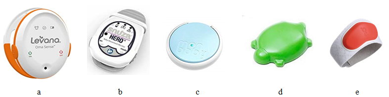Figure 2 a) Levana Oma Sense in the form of diaper clip, b) Snuza Hero (SE) wearable baby abdominal movement monitor as diaper clip, c) MonBaby monitor as a shirt button and d) Mimo turtle as shirt attachment, e) Sproutling baby monitor.